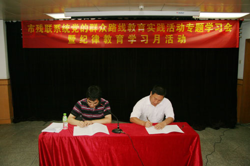 结合纪律教育学习月活动,与会同志一起观看反腐倡廉法纪教育电教片《镜鉴录(五)“一把手”腐败引发的蛀虫群像——广州市民政局违纪违法系列腐败案警示录》。随后,陈学军理事长与直属事业单位领导班子主要负责人(法人代表)签订党风廉政建设责任书。此项工作是贯彻落实中共中央、国务院《关于实行党风廉政建设责任制的规定》,强化市残联直属事业单位领导干部抓反腐倡廉建设的政治责任,保证市委市政府关于党风廉政建设和反腐败斗争各项决策部署落实到位的重要体现。签订党风廉政建设责任书仪式结束后,陈学军同志以“党的群众路线”为主题,结合自已在教育实践活动中的学习心得、调研体会、工作经验、工作计划等,给全体党员干部上了一堂精彩的党课。