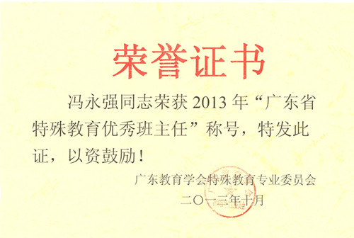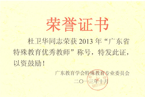 广州康复实验学校杜卫华老师荣获2013年“广东省特殊教育优秀教师”称号、冯永强老师荣获2013年“广东省特殊教育优秀班主任”称号。这是两位老师的荣誉,也是我们广州康复实验学校的荣誉。