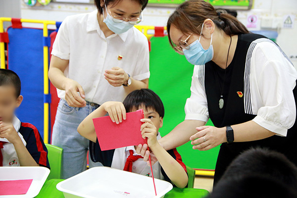“童心向党”主题班会环节中,贾红桃副校长与一(1)班学生一起制作党旗。