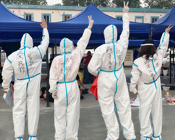 (图2:党员志愿者穿上防护服)