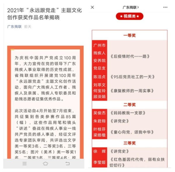 在广东省残联举办的庆祝建党100周年“党旗飘扬”主题征文(短视频)征集活动中,广州市残疾人安养院党总支制作的短视频《后疫情时代——路》获得了短视频类一等奖。