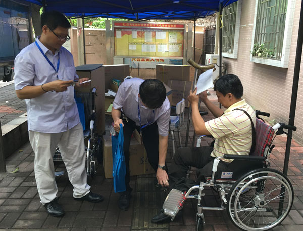 在活动中,党支部书记阮?;厩鬃韵蚶巡屑踩私樯芰四壳肮阒菔胁屑踩烁ㄖ骶呦喙卣?,亲切询问了解贫困残疾人他们目前的生活情况及辅助器具的需求情况。随后,党员及干部职工为他们提供了辅助器具的评估适配服务,切实让残疾人感觉到党和政府的温暖。