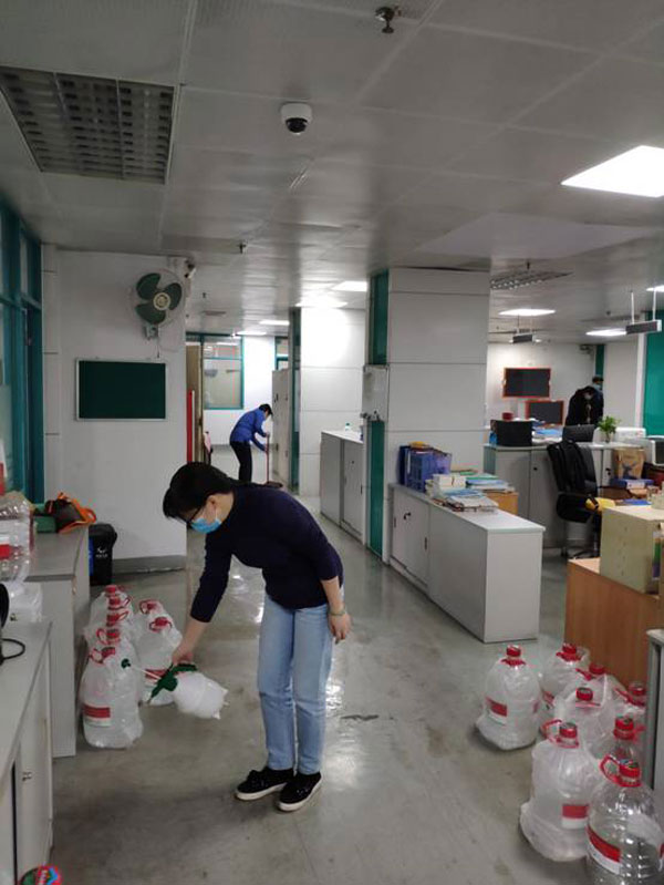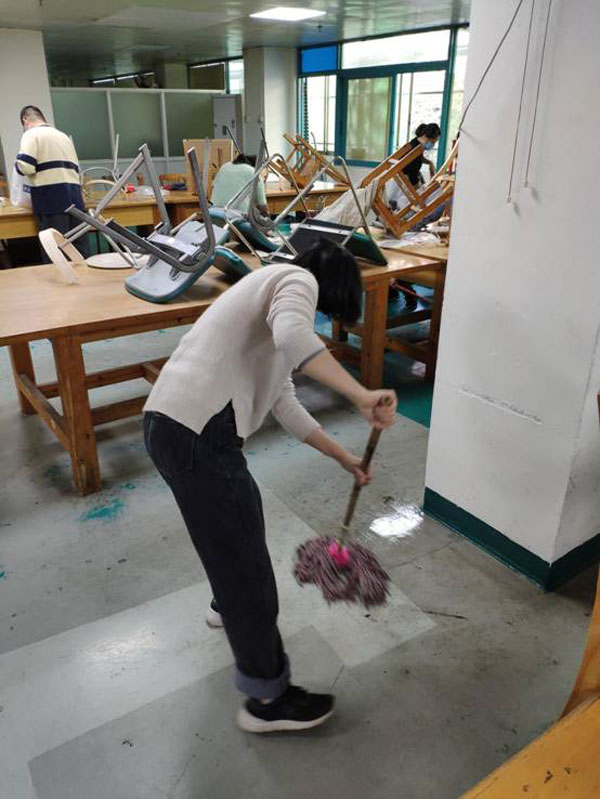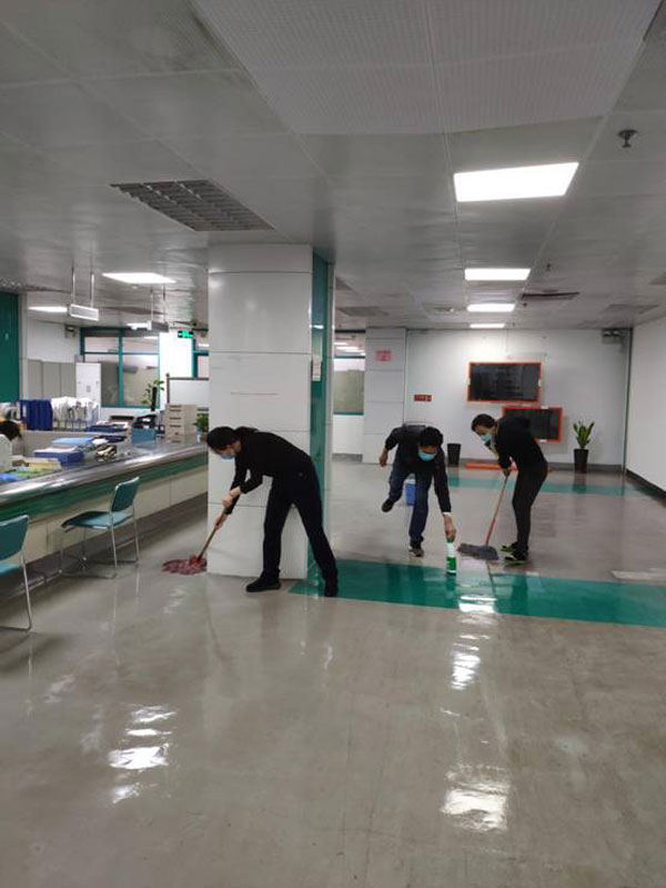 中心党员干部充分发挥带头作用,引导职工,认真仔细清理卫生死角,深度清洗和消毒公共区域和服务大厅的地板,对饭堂用餐区域喷洒消毒水清洁。大家铆足干劲,齐心协助,以实际行动为来访人员以及中心职工营造一个整洁优美、安全卫生的工作环境,为打赢疫情防控战提供安全的环境保障。
