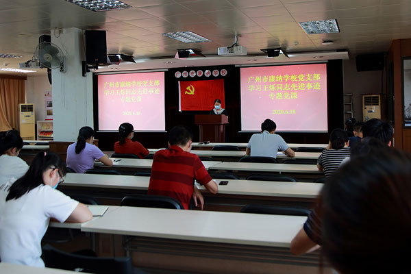 6月18日下午,广州市康纳学校党支部在党员活动室进行了学习王烁同志先进事迹专题党课,由支部书记钟卜金主讲,32名党员参加了学习。