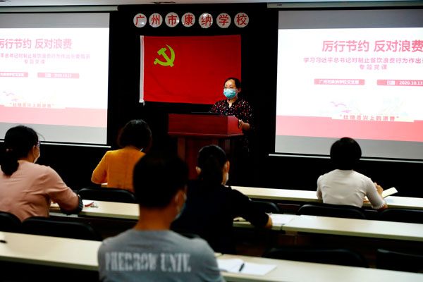 为了贯彻落实习近平总书记对制止餐饮浪费作出的重要指示,弘扬勤俭节约的传统美德,10月13日下午,广州市康纳学校党支部组织了“厉行节约 反对浪费”专题党课。贾红桃副校长主讲,32名党员干部参加了学习。