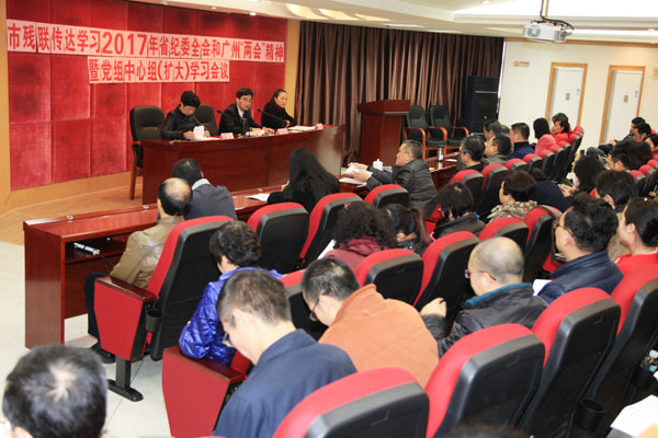 1月17日下午,市残联召开党组中心组扩大会议,传达学习2017年省纪委全会和广州“两会”精神。党组书记、理事长陈学军主持并讲话,机关全体干部和直属事业单位中层以上干部等102人参加学习。