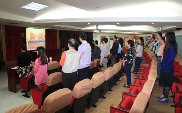 2017年10月18日上午9点,市残联组织机关全体党员干部佩戴党徽在十八楼会议室收看中国共产党第十九次全国代表大会开幕大会,残联机关及直属单位10个分会场共441名党员干部一起观看开幕大会盛况。