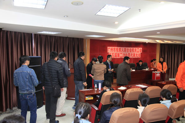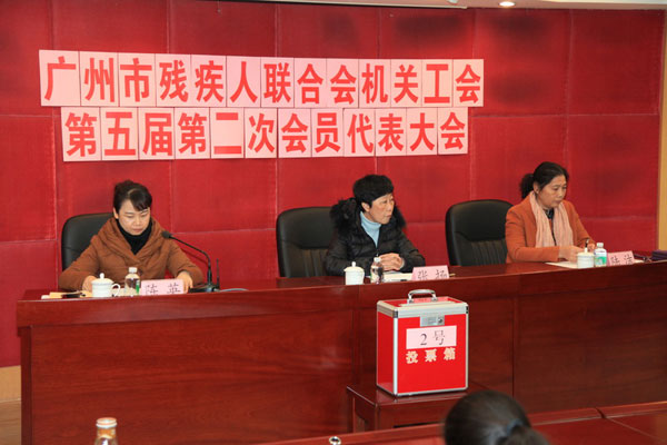 广州市残疾人联合会机关工会第五届第二次会员代表大会于2017年11月24日在广州市残疾人联合会十八楼一号会议室召开。市残联副理事长、机关党委书记张扬、市残联副巡视员陆洁出席会议?;嵋樘娌寡【俾浇嗤疚阒菔胁屑踩肆匣峄毓せ岬谖褰煳被嶂飨?;选举黄娅琴同志为广州市残疾人联合会机关工会第五届委员会委员;选举宋玲同志为广州市残疾人联合会机关工会第五届经费审查委员会委员。