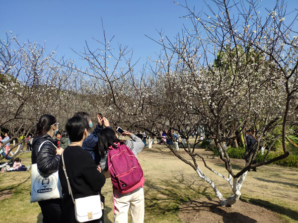 一月正是梅花盛开的时节,职工漫步在花间和竹林中,尽情观赏、拍照,亲近大自然赠予的新绿和阳光,在欢声笑语中感受浪漫冬季。