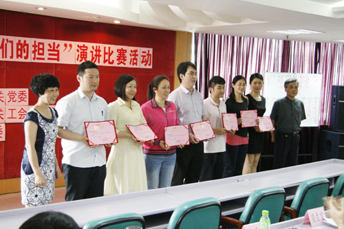 经过二个小时的激烈角逐,比赛评出一等奖1名,二等奖1名,三等奖3名,优秀奖10名、最具人气奖1名及组织奖7名。赛后,市直机关团工委何宇书记对每一位选手的演讲从稿件、现场表现做了细致的点评。市直机关工委副巡视员、市直机关工会工委主席赵大伟用“精心”、“精诚”、“精彩”形容此次比赛活动,对市残联党组、机关党委的组织工作给予高度的肯定,并希望参赛选手以及残疾人工作者们在实际工作中能够坚守岗位,坚定信念,用一份担当的精神为残疾人服务!市残联党组书记、理事长陈学军作总结讲话,他感谢市直机关工委对残联党建工作给予的大力指导和支持,同时勉励系统全体党员干部要以此次活动为起点,结合即将开展的“三严三实”教育实践活动,认认真真以“担当”精神做好残疾人事业各项工作。最后,市直机关工委领导、市残联党组理事会领导为获奖选手和单位颁发证书并合影留念。