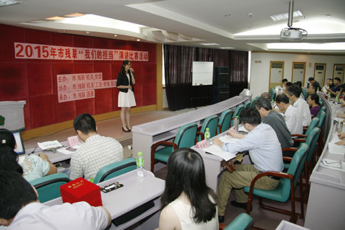 2015年5月5日上午,由市残联机关党委主办,市残联机关工会、妇委会协办,市残联团委承办的“2015年市残联‘我们的担当’演讲比赛在残联18楼1号会议室隆重举行。出席本次比赛的评委有市直机关工委副巡视员、市直机关工会工委主席赵大伟,市直机关妇工委主任余美群,市直机关团工委书记何宇,市残联副主席、巡视员梁左宜,市残联副理事长傅蝶,市残联常务理事、副巡视员钟炼,市残联工会主席、计财处处长杨毅。市残联党组书记、理事长陈学军,市残联副理事长、机关党委书记张扬等领导参加活动。