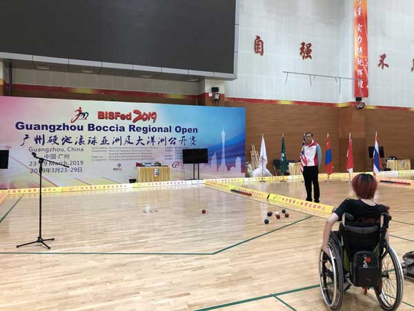 由国际硬地滚球协会(BISFed)主办,广州市残疾人联合会承办的2019广州硬地滚球亚洲及大洋洲公开赛于3月23—29日在广州市残疾人体育运动中心隆重举行。本届公开赛来自亚洲及大洋洲10个国家和地区(中国、中国台北、香港、澳门、伊拉克、日本、马来西亚、蒙古、新加坡、泰国)的59名运动员参加各个级别比赛。