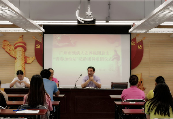 7月31日下午,广州市残疾人安养院团总支在附属学校三楼会议室举行了“青春加油站”超龄团员退团仪式,安养院党总支书记许应照出席。团总支委员、团员及超龄退团青年代表近20人参加了本次活动。