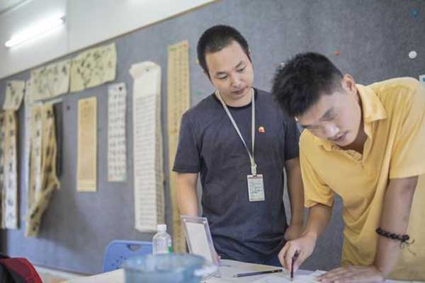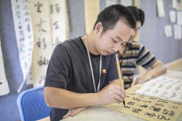 虽然并非科班出身,但他一进农场,就即刻潜心于精神残疾人书画康复培训。他购买了大量书籍,学习精神、心理、艺术疗法等相关专业知识?!霸娇词檠芯?,我越来越发现书法对精神疾病患者非常有用。因为我们国家书法普及率最广,书法也自古就有养身作用,也有研究表明,病人练书法时心率、血压、气息等都有改善?!彼锊ㄋ?,艺术疗法在国外运用非常广,但国内一般采用音乐疗法、园艺疗法,而书法疗法则比较浅显,他决定将艺术治疗的理论运用在书法治疗上。对于比较压抑的人,他让他们将书画作为宣泄的途径,随便涂抹就行;而对于比较狂躁的病人,他则指导他们练楷书。