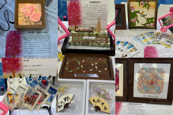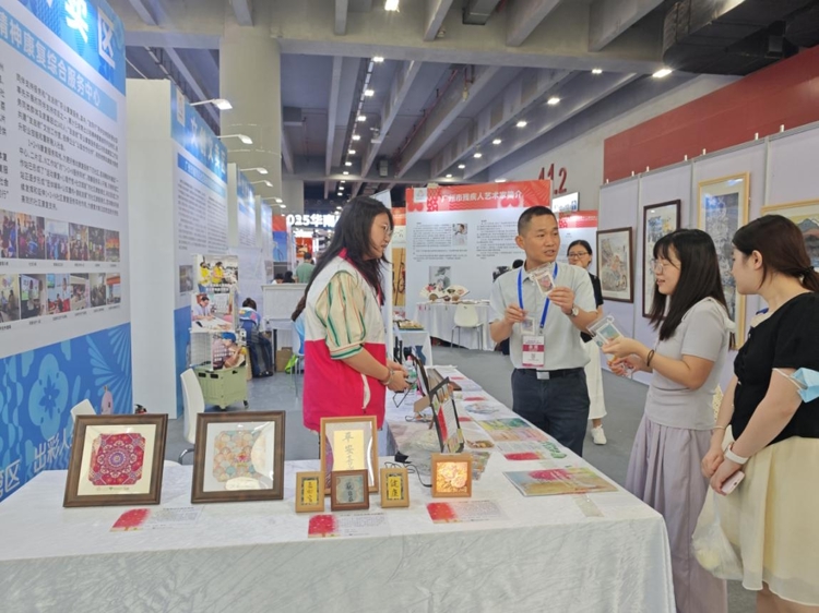 展会现场,众多观众驻足欣赏、交流询问。一件“国画胶片挂件”成为互动焦点——当游客将其举起透光,“蓝天、白云、飞鸟”霎时呈现,令人感叹“换一个视角,真的遇见不一样的精彩”。这份由康复者亲手打造的“心意”,也在潜移默化间播种公益意识:一位家长与孩子共同欣赏螺钿工艺后,主动在支持公益签名处留名,让包容与关爱的种子悄然生长。