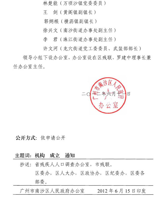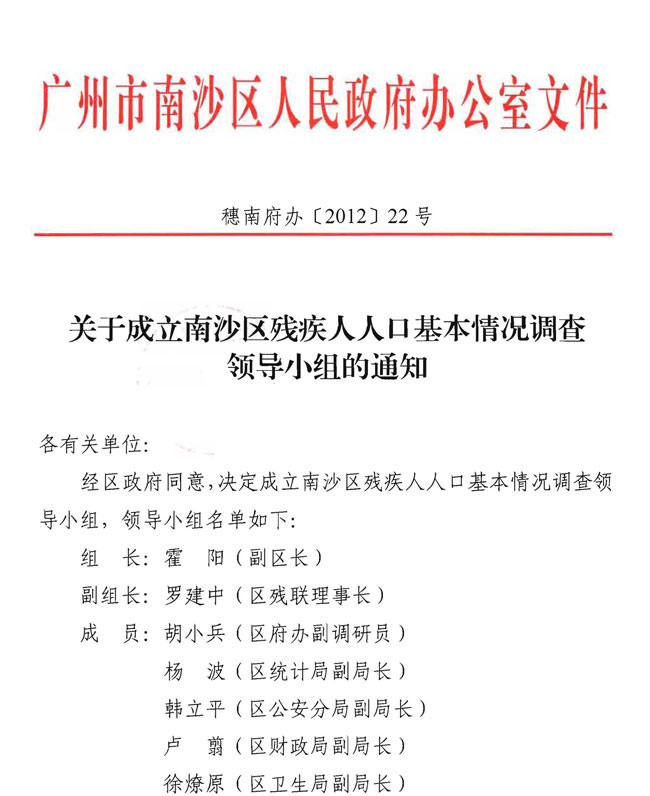 关于成立南沙区残疾人人口基本情况调查领导小组的通知