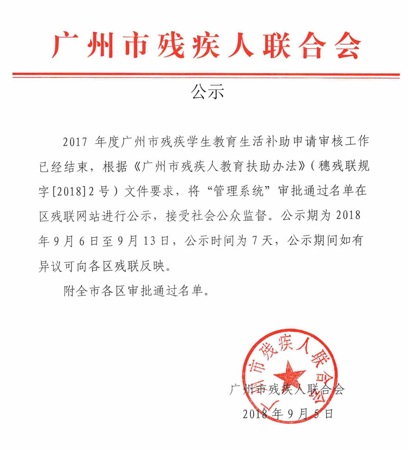 2017年度广州市残疾学生教育生活补助申请审核工作已经结束,根据《广州市残疾人教育扶助办法》(穗残联规字[2018]2号)文件要求,将“管理系统”审批通过名单在广州市残联网站进行公示,接受社会公众监督。公示期为2018年9月6日至9月13日,公示时间为7天,公示期间如有异议可向各区残联反映。
