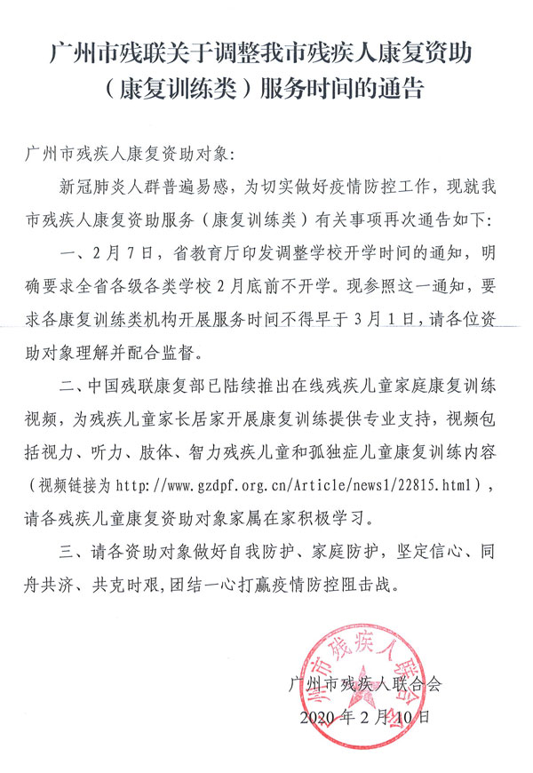 广州市残联关于调整我市残疾人康复资助(康复训练类)服务时间的通告