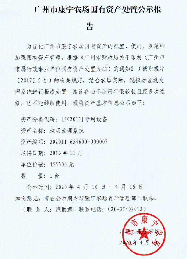 广州市康宁农场国有资产处置公示报告(已经结束)