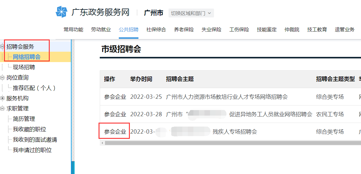 (1)选择左侧【招聘会服务】→【网络招聘会】→2023年高校残疾人毕业生专场网络招聘会→【参会企业】,可查看残疾人招聘会的岗位。
